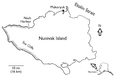 Nunivak Island lies about 30 miles offshore from the mouths of the Yukon and Kuskokwim rivers, at about 60 north latitude (figure 1). Lantis (1986) summarized the geography and biogeography of Nunivak. Winter weather on Nunivak is fiercely cold and wet, with temperatures falling to as low as -31 C. Summers are also cool and wet but mild, tending towards 15 to 20 C.