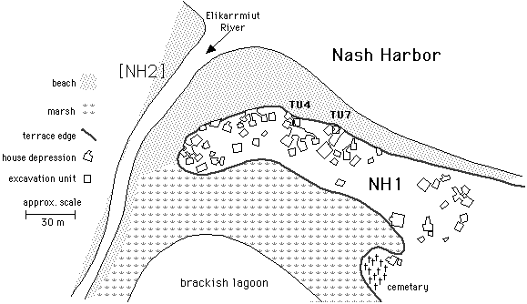 In 1996, I worked at Nash Harbor with University of Oregon doctoral student Dennis Griffin and Oregon State University master's student Chris Broyles. Griffin also hired five Mekoryuk High School students through a grant from the Summer Youth Training Partnership Act Program. Griffin, Broyles, and I were jointly responsible for selecting units for excavation and overseeing the SYTPP workers' screening, survey, and excavations. Broyles and I selected for excavation two shellfish and fishbone middens (TU4 and TU7, see figure 3) visible in the eroding beach bank. Griffin concentrated his efforts on the excavation of house floors, especially near the center of houses where he thought he might find hearths. I also screened displaced slump material obscuring portions of a beach cutbank profile.