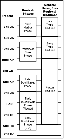 Figure 2, Generalized chronology of archaeological sequences on Nunivak Island (Nowak, 1988) and in the greater Bering Sea region (Dumond, 1987).