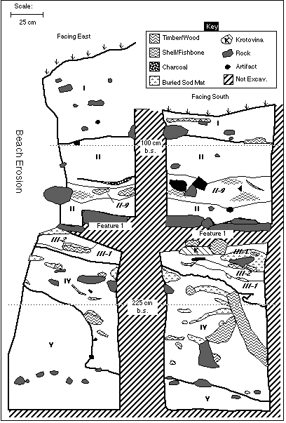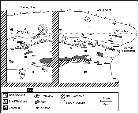 At least one wall was profiled from every finished test unit, and soil samples were retained from most profiled strata. I also made a sketch profile of the exposed beach cutbank in order to target midden areas that might prove useful for faunal research, and refined my sketch profiles in two areas of the beach to help fix stratigraphic sequences for nearby test units. Soils were mapped with a methodology that favored identification of buried surfaces and depositional episodes. Major depositional sequences are designated with Roman numerals; substrata that may represent single depositional episodes within the stratum are designated with Arabic numerals. Therefore, stratum III-1 indicates the first identified substratum in major stratum III.