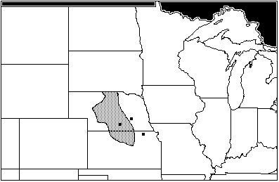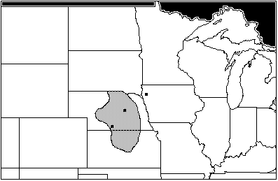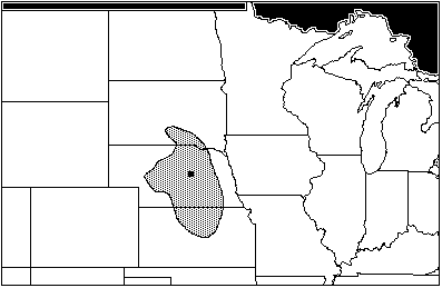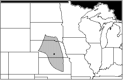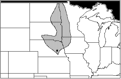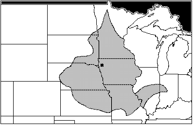 The oldest site, Rainbow, in northwestern Iowa, also has the longest record of habitation. It contains four cultural horizons dating from AD 250 to AD 675. (Falk & Semken 1990: 145 164.) The Rainbow assemblage from all four horizons included: Sylvylagus floridanus, the eastern cottontail; Citellus tridecemlineatus and Citellus franklinii, the thirteen-lined ground squirrel and Franklin's ground squirrel; Sciurius niger, the fox squirrel; Geomys bursarius, the plains pocket gopher; Synaptomys cooperi, the southern bog lemming; and Microtus ochrogaster, the prairie vole. The area of maximum sympatry for all four horizons is fairly large, stretching north into northwestern Minnesota, west to the Nebraska panhandle, south to the Ozarks of Missouri, and along the Mississippi. G. bursarius defines the eastern border of the area of maximum sympatry-- generally along the Mississippi River, with a projection into central Illinois and Indiana (Figure 1). All seven of the species are found in this area. The assemblage is dominated by eastern fauna, many of which live in wooded or marshy settings (i.e. Sciurius niger, Sylvilagus floridanus, and Synaptomys cooperi.) The others, however, show a favoritism towards open or meadow settings.