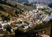 The wonderful Vianden Youth Hostel (IYH) is visible as the large pinkish building in the center right of the picture to the left |
